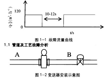 被測液從A流向B(如圖1-2),傳感器水平安裝,電極水平,傳感器下游2m處裝有調(diào)節(jié)閥,從圖中可以排除由于傳感器中急劇潴留氣和傳感器后無背壓等情況導致的測量脈動情況產(chǎn)生。