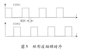 該電路主要由勵(lì)磁時(shí)序發(fā)生單元、三態(tài)緩沖器及隔離光耦組成。勵(lì)磁時(shí)序由雙氧水流量計(jì)系統(tǒng)的控制核心產(chǎn)生。采用DSP的EPWM外設(shè)模塊,通過設(shè)定其內(nèi)部定時(shí)器的工作模式發(fā)出所要求的勵(lì)磁頻率的勵(lì)磁時(shí)序PWM信號(hào)CT_1和CT_2。由于勵(lì)磁控制系統(tǒng)中的勵(lì)磁工作電源的電壓要比DSP的工作電源電壓高得多,為防止勵(lì)磁電路故障對(duì)系統(tǒng)控制核心產(chǎn)生致命影響,采用光耦將控制部分與勵(lì)磁部分進(jìn)行隔離。另外,由于DSP引腳的驅(qū)動(dòng)能力有限,所以在DSP與隔離光耦之間加入三態(tài)緩沖器以驅(qū)動(dòng)隔離光耦的輸入級(jí)。并且,DSP能夠通過GPIO口控制三態(tài)緩沖器上的使能引腳來使能和禁止勵(lì)磁,以在檢測(cè)到電路故障時(shí)迅速關(guān)斷H橋所有橋臂。該勵(lì)磁時(shí)序產(chǎn)生電路通過軟件編程可產(chǎn)生如圖5所示的單頻矩形波。在實(shí)際應(yīng)用中,由于組成H橋的達(dá)林頓三極管與MOS管導(dǎo)通與關(guān)斷的時(shí)間不一致,易在勵(lì)磁方向切換瞬間,產(chǎn)生上下橋臂同時(shí)導(dǎo)通的現(xiàn)象,反映在勵(lì)磁電流波形上為一幅值很高的窄脈沖。該脈沖電流不僅容易引起遲滯比較電路的誤輸出,從而導(dǎo)致高低壓切換電路與電流旁路電路的誤動(dòng)作,而且對(duì)恒流控制電路產(chǎn)生沖擊,減小三端穩(wěn)壓芯片的使用壽命,同時(shí)還會(huì)產(chǎn)生EMC電磁干擾,給測(cè)量精度帶來影響。所以實(shí)際應(yīng)用時(shí),如圖5所示對(duì)方波勵(lì)磁時(shí)序添加死區(qū),可以明顯減小上述現(xiàn)象。
