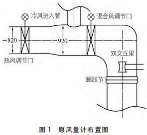 從流量測量角度講,影響流場的主要為熱風調門、擴管、彎頭以及一次冷風的混入,閘板門和混合風調門由于運行時處于全開狀態,影響可忽略,目前使用了單點雙文丘里管的測量方式,有以下問題: