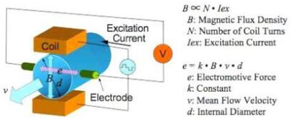 使用管道式電磁流量計(jì)測(cè)量的液體流量必須導(dǎo)電是非常重要的。法拉*定律表明,信號(hào)電壓(E)取決于平均液體速度(V),導(dǎo)體的長度(D)和磁場強(qiáng)度(B)。因此,將在管的橫截面中建立磁場。