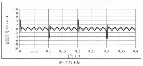 工頻干擾是高溫電磁流量計常見的干擾源。當流量計處于電源形成電磁場中時,由于分布電容的存在,以電磁波的輻射形式干擾電極信號,或者是由供電電源引入的工頻串擾,工作現場的工頻共模干擾,其產生的物理機理均是電磁感應原理。幅度與流量信號相比,往往要大幾個數量級,頻率與供電電源頻率相同。如圖4所示,線圈驅動頻率為5Hz的電極信號,被耦合了50Hz的工頻干擾,幅度大概相當于1feet/s。