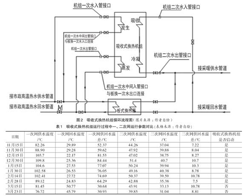 如圖1所示,以某熱力站為例,原熱力站一次網供回水設計溫度為130℃ /70℃,二次網設計供回水溫度為80℃ /60℃,這其中的不可逆損失在圖中顯而易見。我們可以利用增熱型吸收式熱泵,即高溫渦街流量計,將一次網供水作為高溫驅動熱源,為板式換熱器中的回水提供驅動力,繼而發揮熱泵效應,吸收一次網回水的低溫熱源的熱量,再與板式換熱器換回的熱量一起作為二次網的供水一起供給熱用戶。