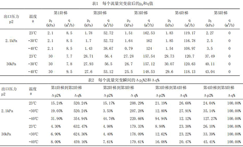 為了深入研究溫度及流量突變對高溫電磁流量計響應速度的影響趨勢,把每個流量突變點前后的出口壓力p2,流量q列表如表1所示。